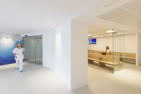 La nova àrea de recepció, àmplia i lluminosa, permet oferir una millor acollida i comunicació als pacients, i compta amb dues àmplies sales d'espera. La sala per a pacients adults té una capacitat de fins a 22 persones, seients còmodes i parets de vidre, per augmentar la percepció d'espai, obertura i contribuir a la tranquil·litat de les persones. El disseny, colors i mobiliari de la sala per als infants i les seves famílies, en canvi, estan orientats a facilitar l'espera de nens i nenes.