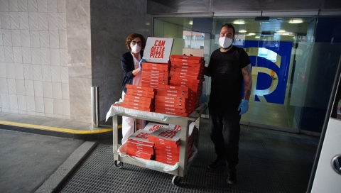 Bajo el lema "delivery especial" y siendo conscientes que los trabajadores del sector sanitario no dejamos de sumar horas a nuestras jornadas para atender a todos los pacientes y gestionar el volumen que esto conlleva en todos los departamentos, el restaurante Can Pizza hoy nos ha obsequiado con 100 pizzas que hemos repartido entre todo el personal.