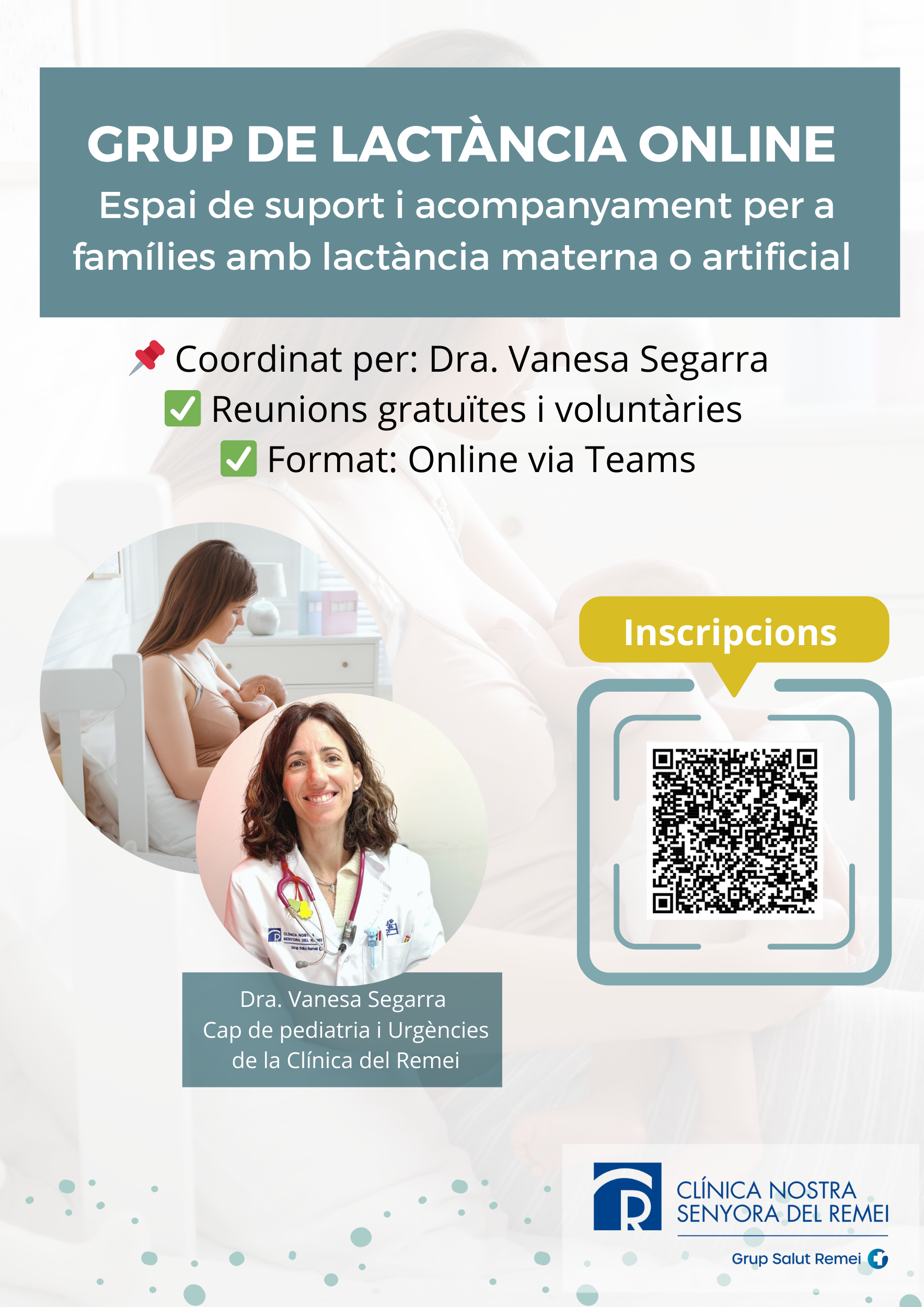 Aquests grups estan coordinats per la Pediatra Dra. Vanesa Segarra. En el grup trobaràs el suport per a la lactància i criança, mitjançant conferències o xerrades inicials de caràcter sanitari per part de la Dra. Vanesa Segarra, i posteriorment passa a ser un espai amb una posada en comú de manera voluntària per part de les mares assistents sobre experiències, alegries i dificultats, dubtes i diferents solucions, en un ambient acollidor i respectuós.